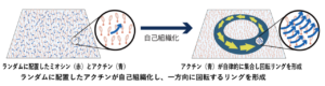 千葉大学大学院理学研究院の原口武士助教、伊藤光二教授、京都大学大学院工学研究科の井上康博教授、九州大学先導物質化学研究所の森俊文准教授、大阪大学大学院理学研究科の松野健治教授らの研究グループは、細胞内のタンパク質が、特別な設計図や指令がなくても、自ら秩序だった構造を作り出す仕組みを明らかにしました。またその仕組みとして、分子モーター (ミオシンCcXI)注1)とアクチン注2)という2種類のタンパク質の相互作用だけで、アクチンが自律的に集まり、一方向に回転し続けるリング状の秩序構造が自律的に形成されることを示しました (図1、および巻末の二次元コードより顕微鏡動画を視聴可能)。これは、細胞内に見られる秩序やキラリティ(左右非対称性)が、ある種の分子モーターの働きを起点として、自然に生じ得ることを示しています。本研究により、生命の形や左右非対称性がどのように作られるのかという根源的な問いに答えるだけでなく、自律的に動くバイオマテリアルの設計など、医療、エネルギー、電子機器の分野において重要なナノテクノロジーへの応用も期待されます。